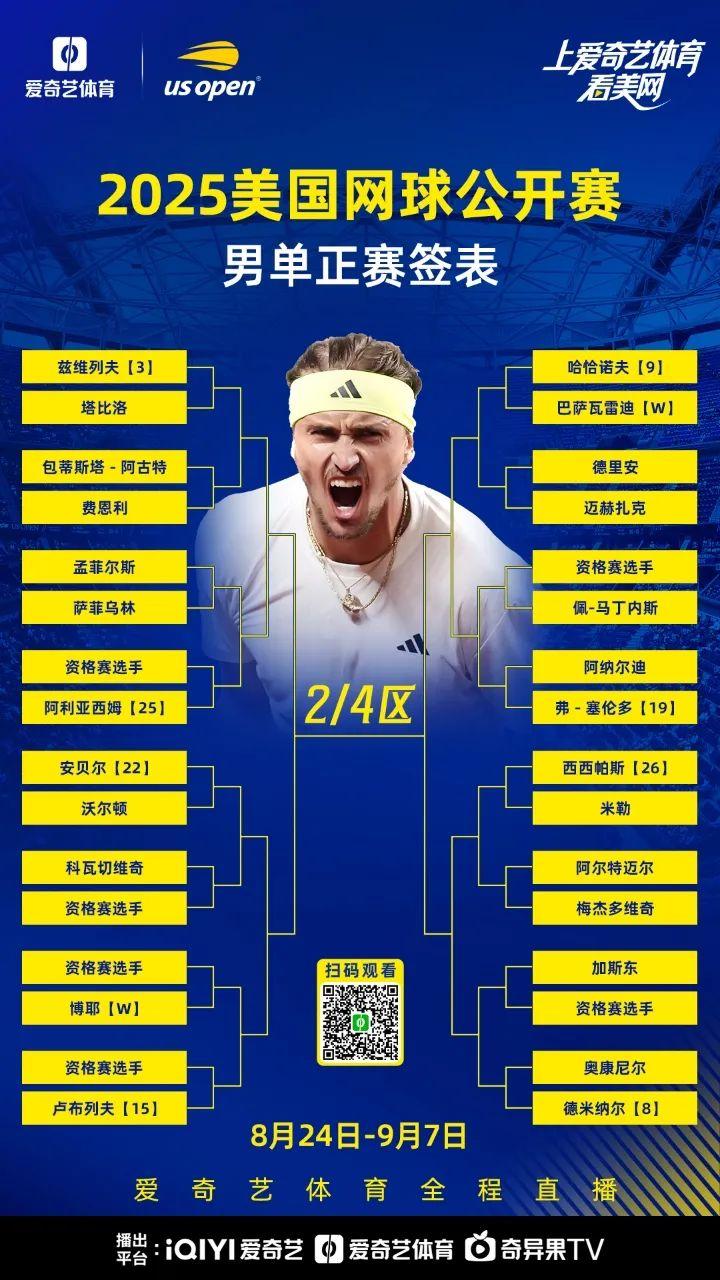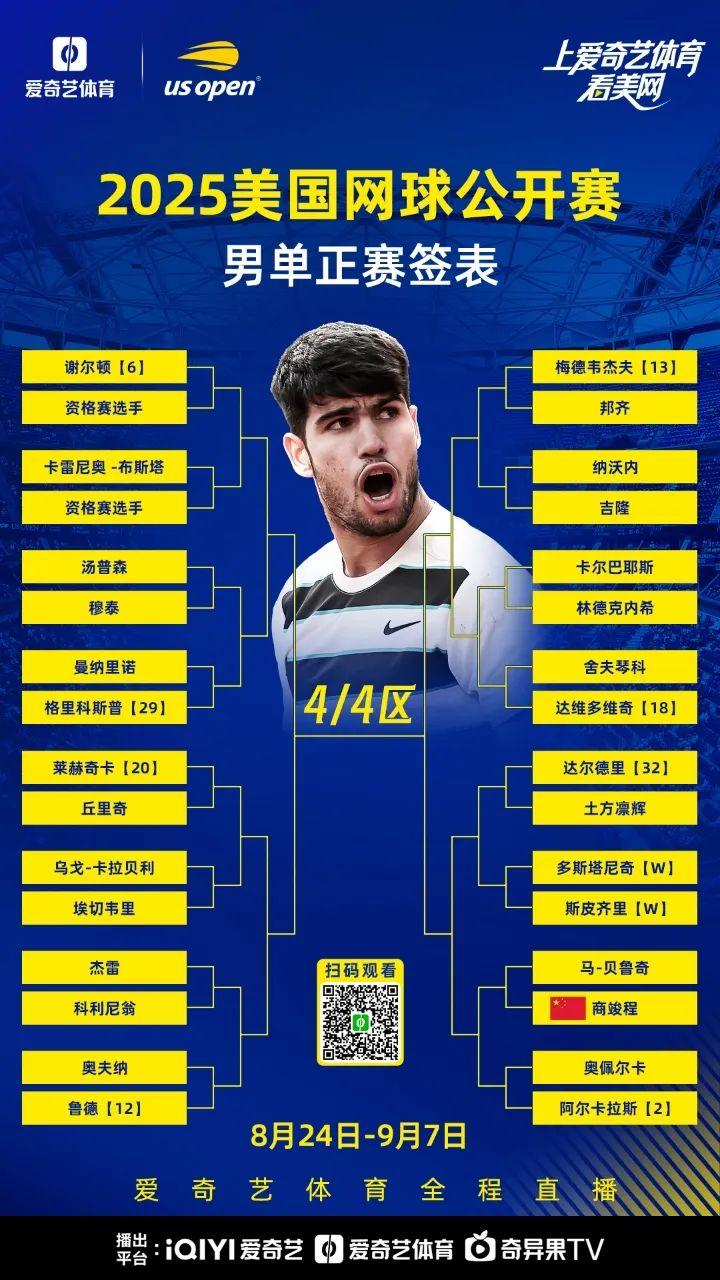 男单方面,世界第一辛纳与阿尔卡拉斯作为赛会前两号种子领衔出战,兹维列夫、弗里茨、德雷珀、谢尔顿、德约科维奇、德米纳尔分列3-8号种子。